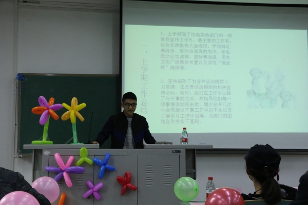 首先,明升体育88学生会主席刘旭就上学期的学生工作进行了简要总结和本期两委会主要工作计划,并针对工作中存在的问题提出整改建议。随后,各部门代表依次上台通过ppt展示和讲解,详细介绍了工作开展情况。