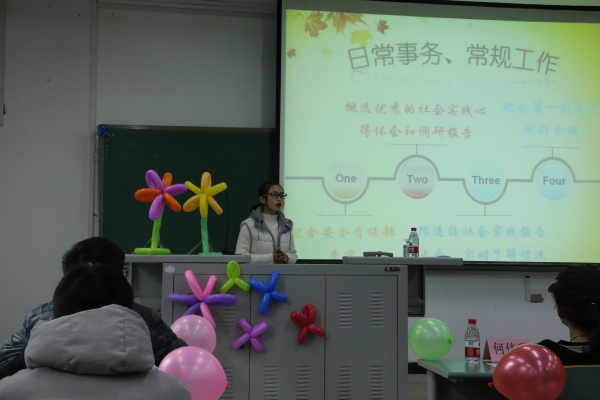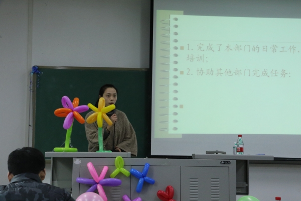 最后,何玲玲老师做了大会总结,她指出:1、希望同学们合理分配学习与工作时间;2、加强交流和沟通以及信息的反馈,以利于提高工作效率;3、两委会成员要加强自身素质修养,为全院学生树立正面形象。何玲玲强调,两委会作为一个大家庭,希望每位成员都能为之努力和奋斗,展现学生工作的无限魅力和自身的青春风采。