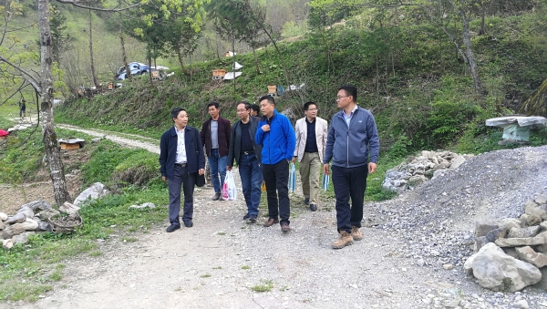 临别前,大家一起查看唐全益家的中蜂养殖情况。唐全益指着远处的新蜂箱说道,“这就是今年才购买的22个新蜂箱,计划今年发展中蜂群达到80个”。大家听了都非常高兴,因为中蜂养殖是唐全益家脱贫增收的保障之一。