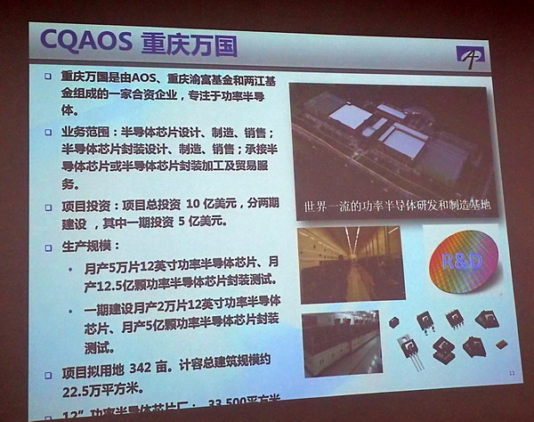 重庆万国半导体科技有限公司是由AOS公司与渝富集团、两江新区战略性新兴产业股权投资基金合资经营。于2016年3月落户重庆两江新区水土工业开发区,项目总投资10亿美元,占地340亩。分两期建设12英寸功率半导体芯片制造及封装测试生产基地。具备芯片设计、晶圆制造、封装测试全产业链能力。产品不仅将销往国内外,还将广泛应用于本地优势企业,对重庆市发展汽车、智能终端、轨道交通产业都具有积极推动作用,市场空间巨大。