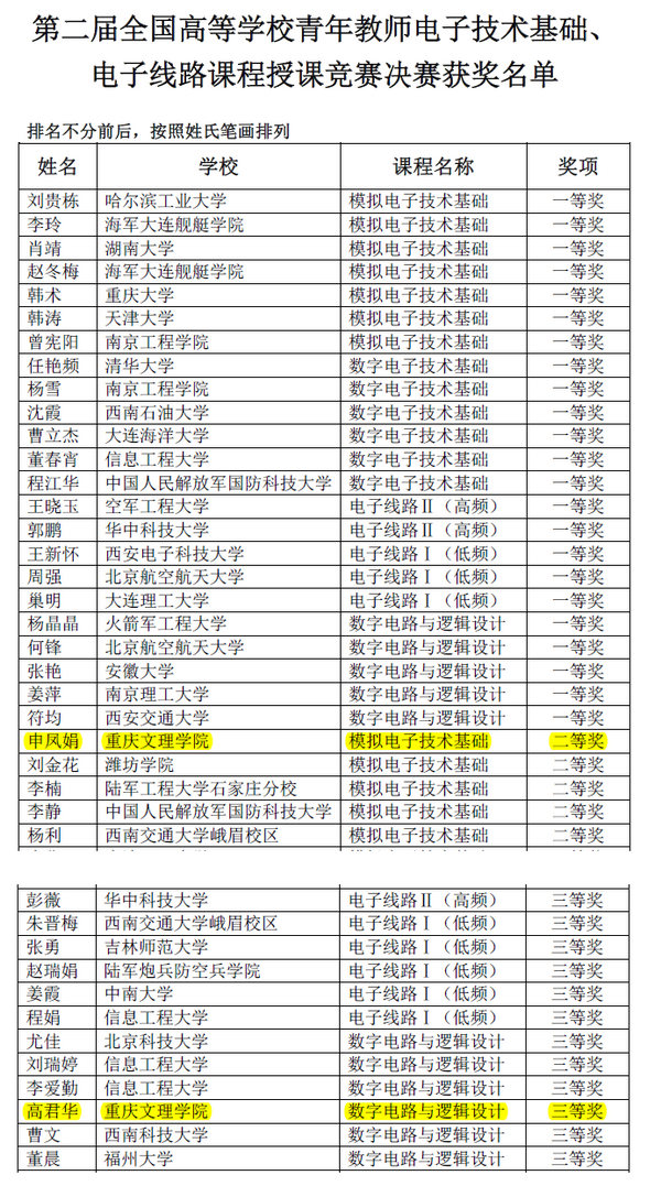 本次竞赛由教育部高等学校电工电子基础课程教学指导委员会、中国电子学会电子线路教学与产业专家委员会、全国高等学校电子技术研究会联合举办。比赛分为初赛、决赛两个阶段,初赛分西北、华东、东北、华北、西南、中南6个赛区。在西南片区初赛中,高君华、申凤娟表现出扎实的教学基本功、先进的教学理念和方法、良好的教学能力与综合素养,双双斩获一等奖。