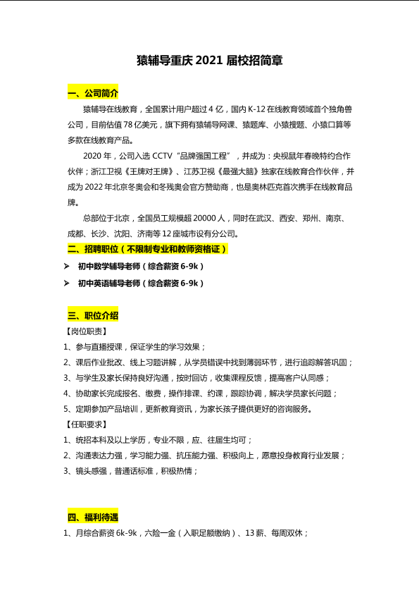 猿辅导重庆2021 届校招简章