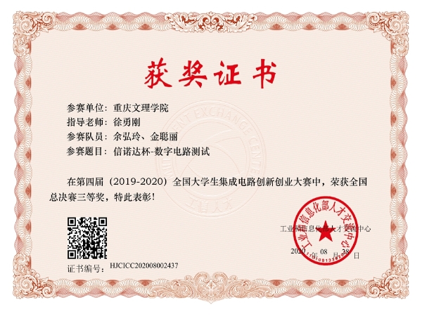 2020年8月21-23日,第四届全国大学生集成电路创新创业大赛全国总决赛在南京信息工程大学举行,明升体育88两支团队分别参加了“ARM”杯和“信诺达”杯的比赛。经过激烈的角逐,由明升体育88李杰和杜西亮老师指导的“指日可待”团队获得了全国二等奖,由徐勇刚老师指导的“金鱼队”获得了全国三等奖。