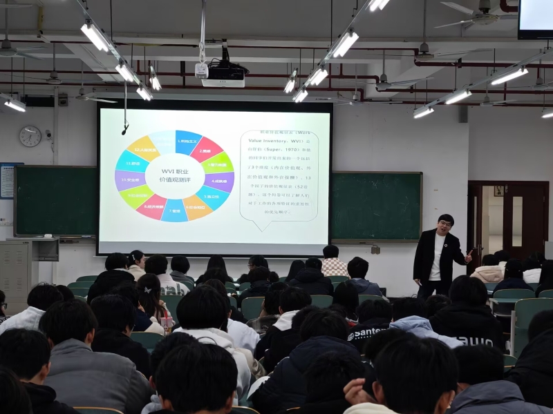 讲座围绕“认知自我、职业认知、生涯定位、原型工具、规划路径”五个方面展开,郭锐结合“中国制造2025”“数字中国”和重庆“33618”现代制造业集群体系背景下芯片、通信等领域的人才需求,引导学生通过职业性格、兴趣、能力和价值观四个维度进行系统探索。